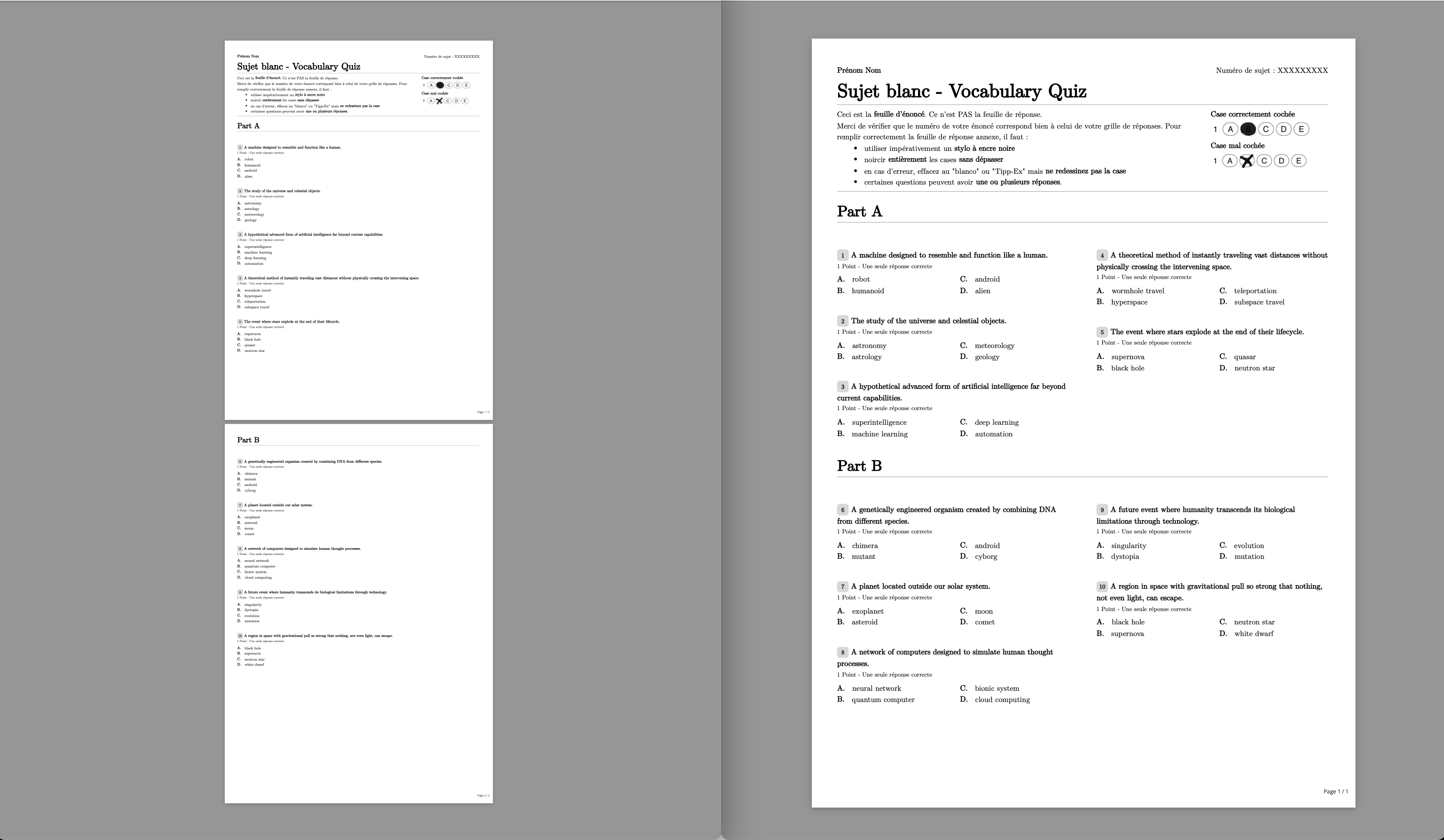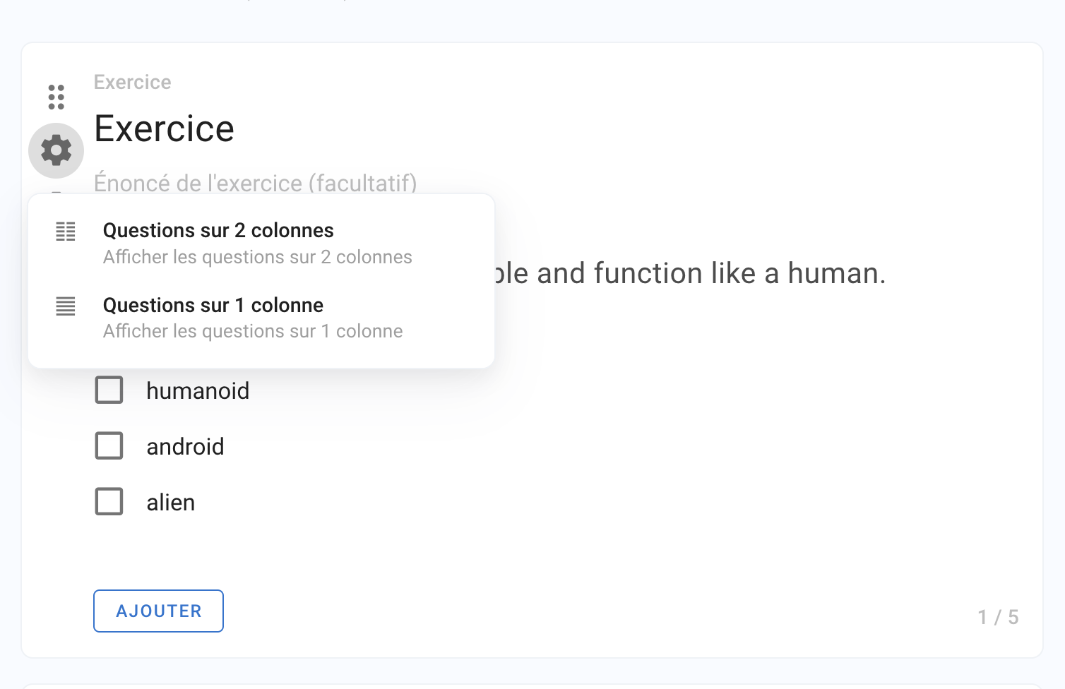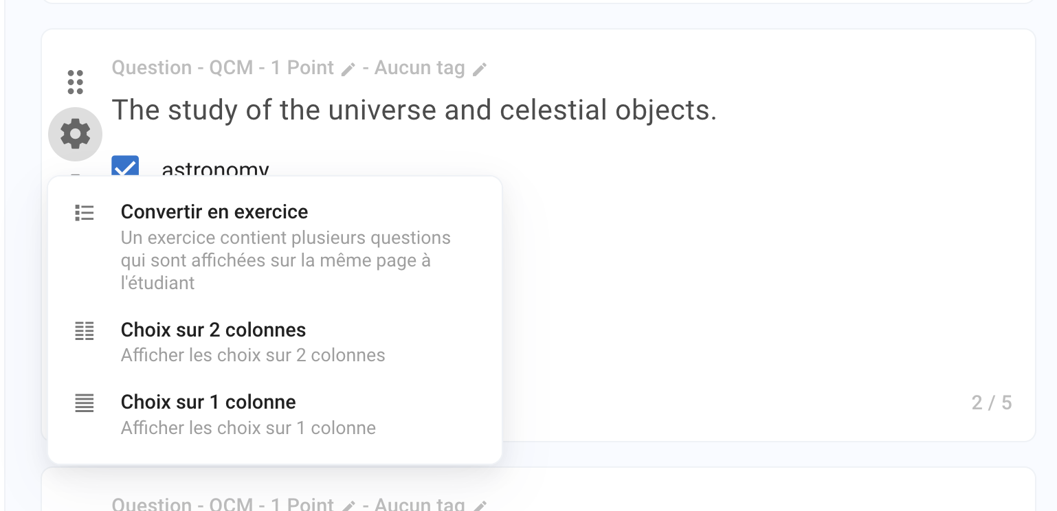 Pour personnaliser encore plus la mise en page, vous pouvez le définir au niveau de chaque question et exercice. La configuration locale préempte la configuration globale.