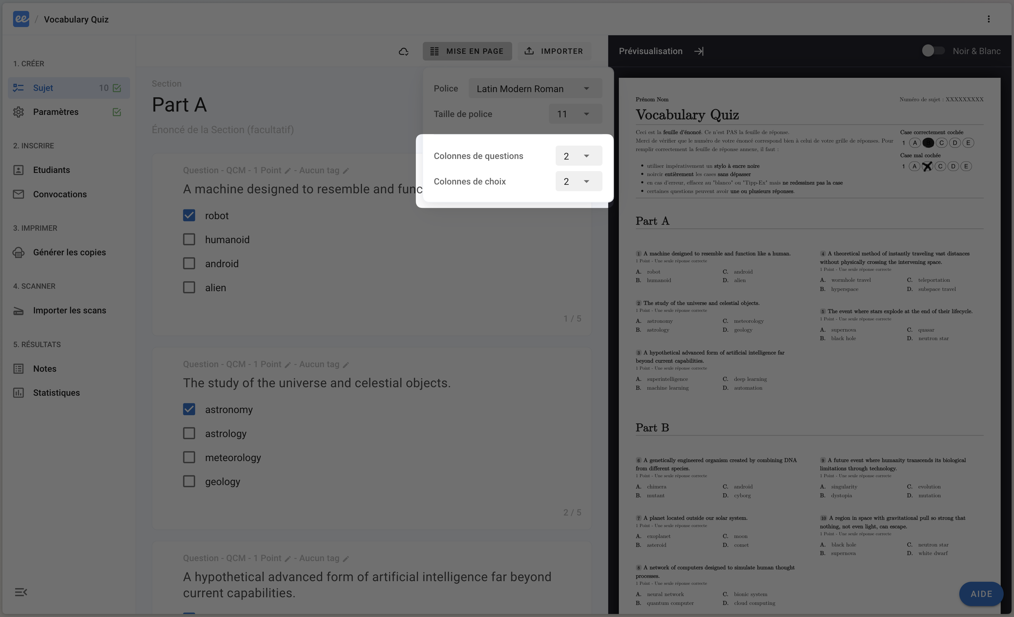 Pour modifier la mise en page des questions et choix sur 1 ou 2 colonnes, cliquez sur MISE EN PAGE dans l’éditeur du sujet puis sélectionnez 1 ou 2 comme nombre de colonnes pour :