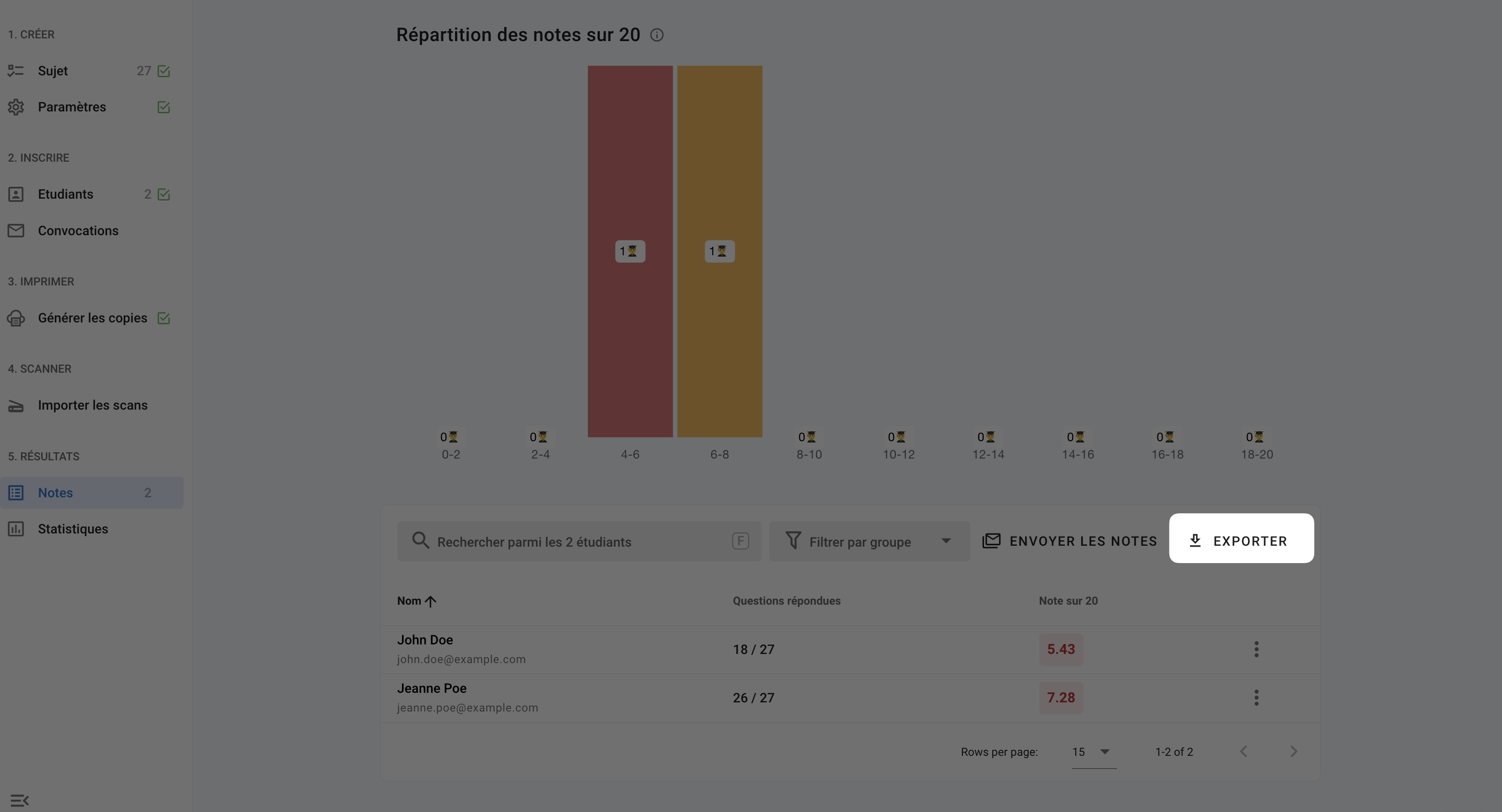 Dans l'onglet Notes cliquez sur EXPORTER en haut à droite, vous pouvez alors exporter les notes au format Excel sous 2 formats :